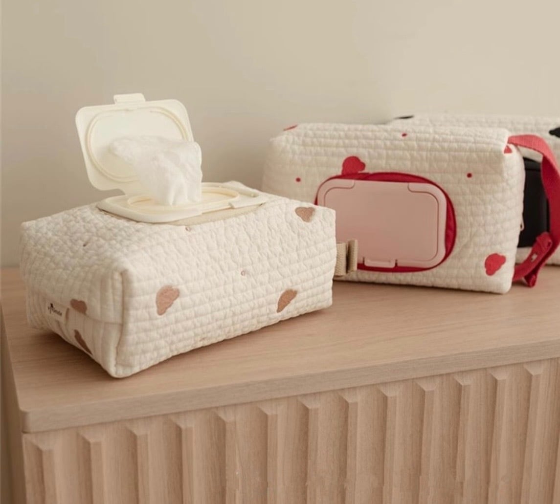 くまさん柄のかわいいウエットティッシュカバー୨୧ ベルト部分にはスナップボタンが付いているので、いろいろな場所に装着可能!持ち運びも◎